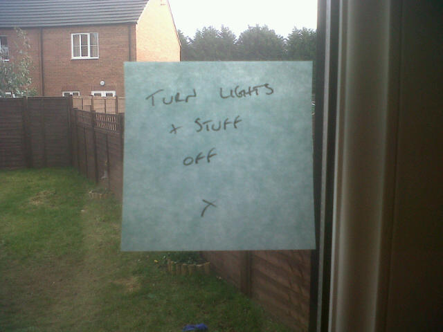 Project365 #37 February 6, 2011February 6, 2011 ~ Phil Lengthorn ~ Leave a comment I’m forever banging on about saving money by turning off lights, music, tv, etc. The girls are always leaving the house draining the grid of power! Little did I know that a simple little post-it on window would solve the problem.