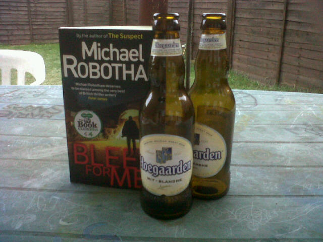 Today’s picture is…..Hoegaarden in the garden, with a trashy crime novel!
