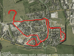 After a long day at work, lots of marking, after school club and bus duty. Together with the fact that I worked hard at last night’s club training, tonight’s run was never going to break records. Just a gentle 2.5 miles around the new estate opposite. They have been busy building new roads and houses, so it was quite a surprise when I discovered them – they’re not even on the map yet – in fact it looks like I was randomly running around in a field!