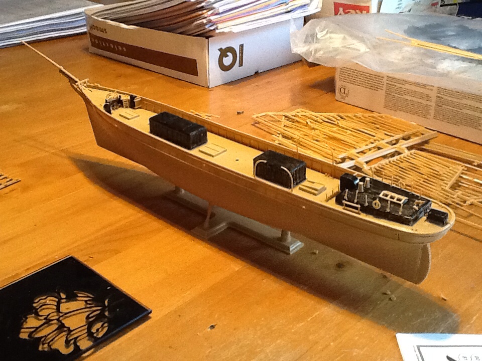 Stage 10 requires yet more small pieces to be added to deck before we look to assemble the masts and associated stuff. Not to forget loads more painting. This is how it looks at the moment…..I realise it looks much the same as a couple of days ago…..