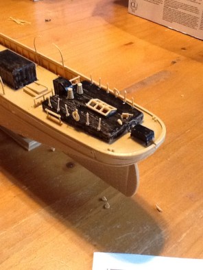Problems occurred since last blog entry: stupidly small pieces, holes not big enough to fit pieces and badly moulded plastic pieces, to name but a few. Close-up of deck shows some very shoddy model building…