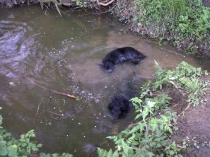 What with all the recent rain there are lots of deep water puddles around, and the dogs, for some unknown reason, actually like jumping in them and rolling around. Now this is ok if the puddles are reasonably clean, but does become a problem when they are of the black smelly variety. So any run around the woods with the dogs usually takes in the ponds at some stage so the dogs can have a swim and wash down. The ponds at Bourne Woods are around 1 1/2 miles from the entrance, so the dogs get plenty of time to dry off before going home.