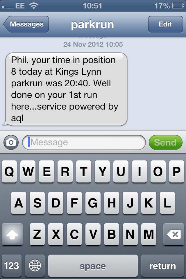 I would love to have a closer parkrun that I could attend regularly, they are a great idea, not only do you get a good free timed 5km race, but the chance to chat to fellow runners over a coffee at the end. And as well as emailing you with your finishing details, they text you your position and time within 30 mins of finishing….
