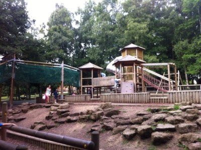 This playground may have looked fantastic, but the items in the playground had a dark side: they were slightly more tricky than they looked. Standard swings: no problems. Springy bouncy jeep thingy: fine, until a lad jumped on and began rocking the thing like it was traversing the moon. Slide one: no problems. Slide two: huge metal corkscrew slide, which was vey high, had one go but too scary to attempt again. Slide three: steeper than it looked, Grace even managed a bit of free fall at one stage whilst travelling down it. Scramble net bridge: tried but too difficult, one step on and feet fell through holes.