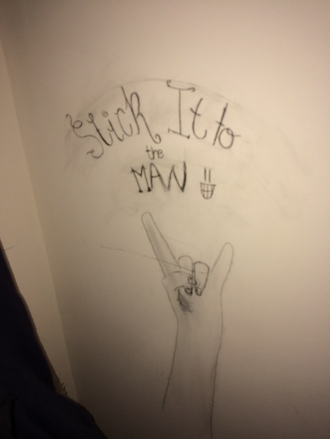 Amy has been left home just about a year and today I found, in the inside of the built-in wardrobe, a little reminder of her civil disobedience…