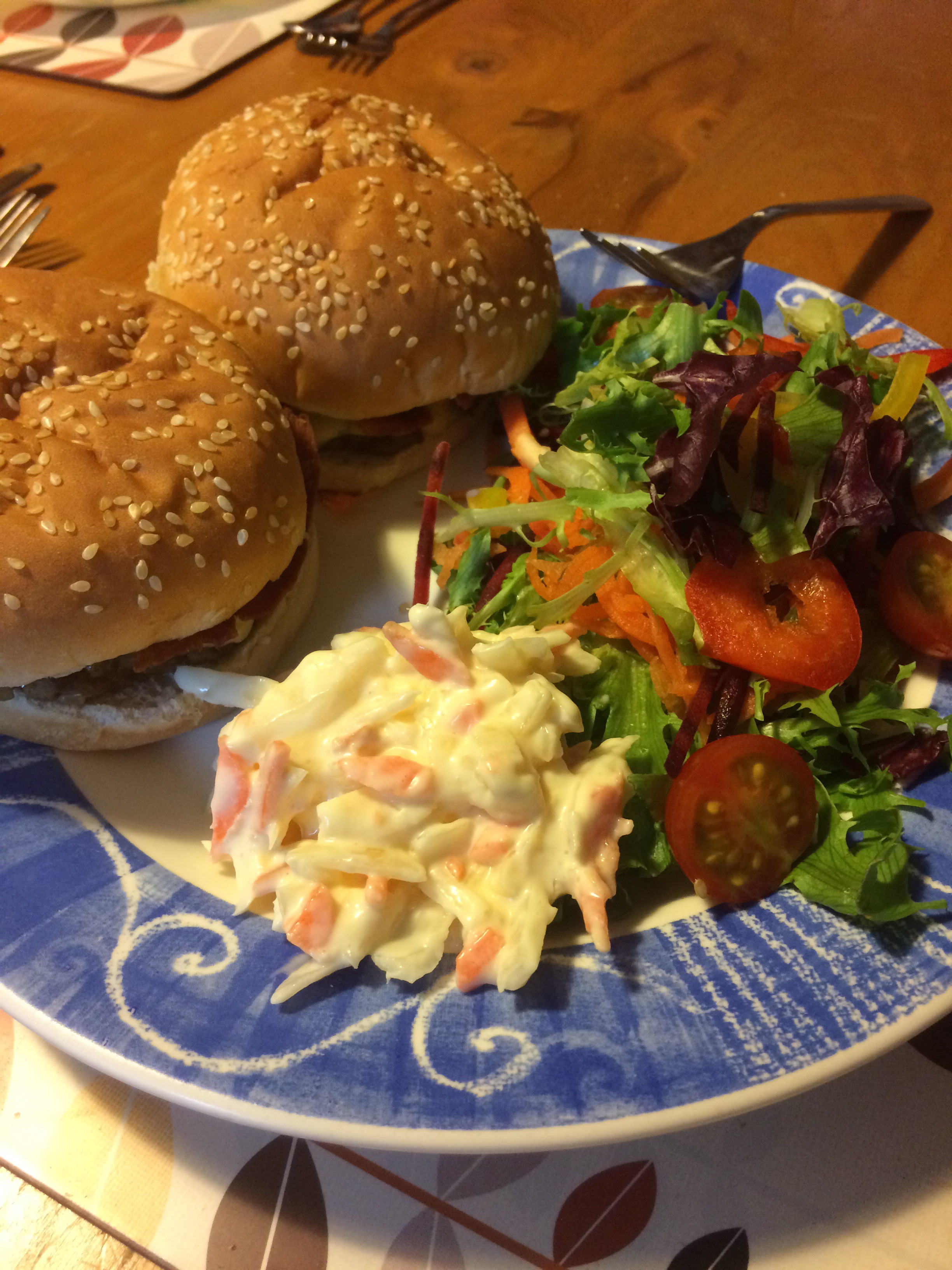 This was today’s dinner, homemade burgers and salad…