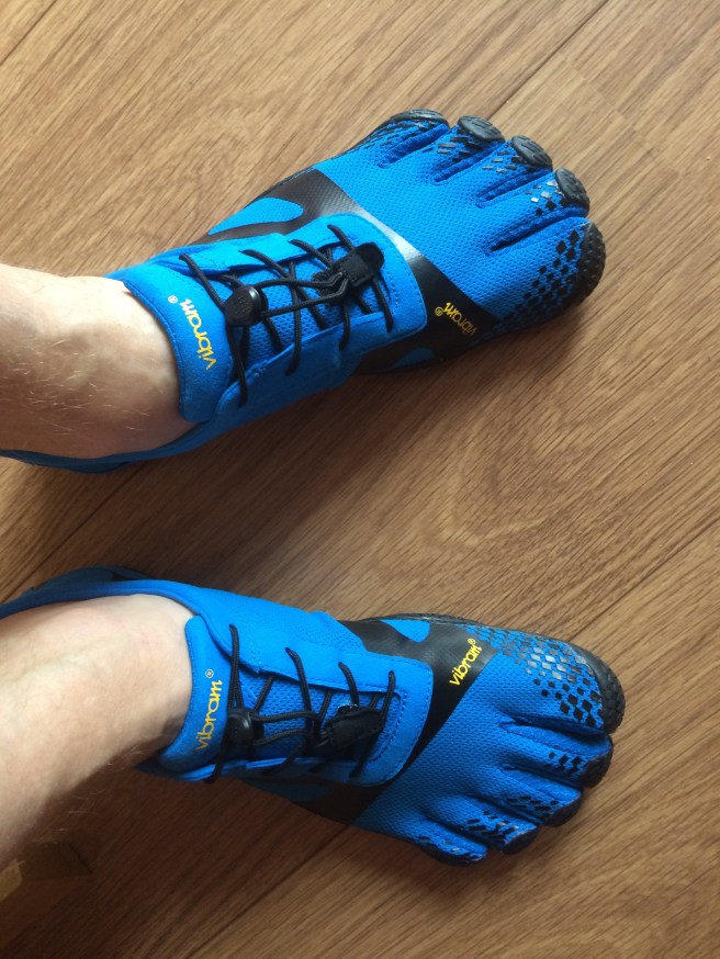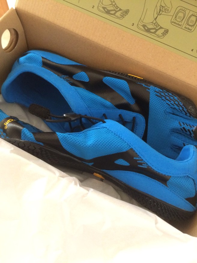My first ever pair of Vibram Fivefingers; in a very fetching bright blue I might add.