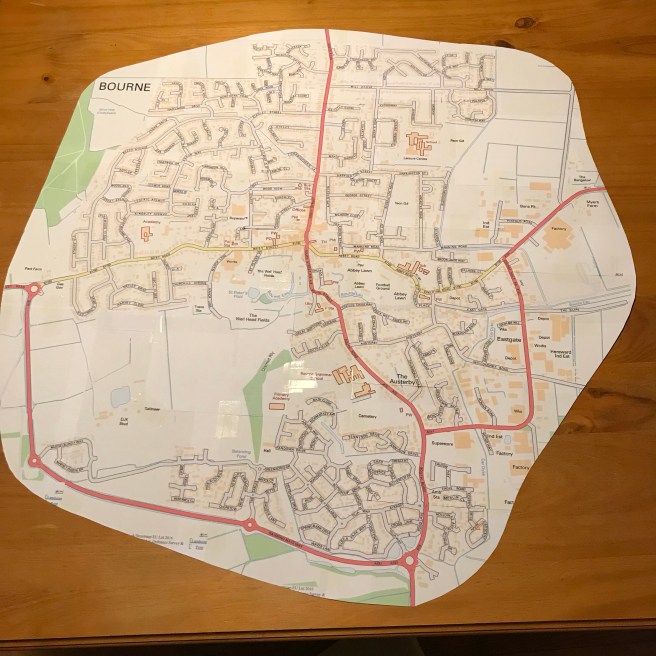 Over the past couple of days I have printed out about a dozen or so A4 sheets of Bourne, where I live, and painstakingly put them together to create this: