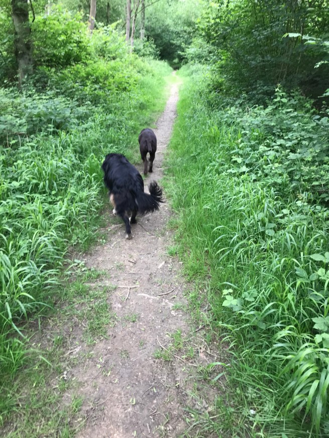 Today’s run, after getting out of work as soon as possible, was a gentle couple of miles at the woods with the dogs. I say dogs because at the moment we’re dog sitting an extra one.