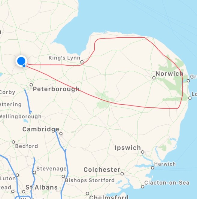 I had also pre-booked a room for tonight – my brother-in-law, Kev, lives on the Norfolk Broads – so that just left a short journey in land. I say short journey, but by the time I avoided some dual carriage ways and other massive roads, it wasn’t until 7pm before I got there.