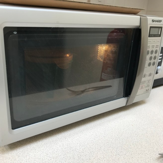 It’s pretty easy to tell when it’s been an uneventful day. Today’s picture: the microwave in the staff room which contained a pot of leftover veggie chilli and rice from last night.