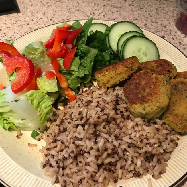 I was in charge of dinner tonight: homemade falafels, wild rice with quinoa and salad. Cushty.