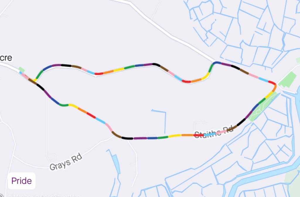 A lovely 5m run following the normal route. Increasing the pace as the miles got done.