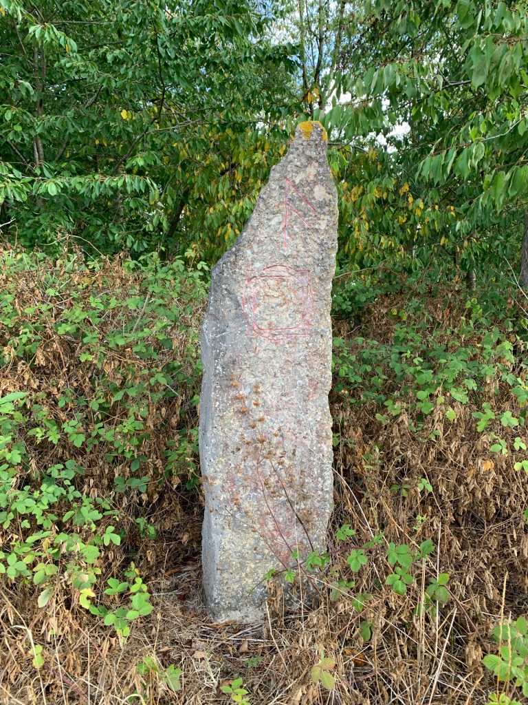 The top two symbols are for water and earth and below is the runic character for Laguz – the Leek – Lake or Water. This stone is right next to the river.