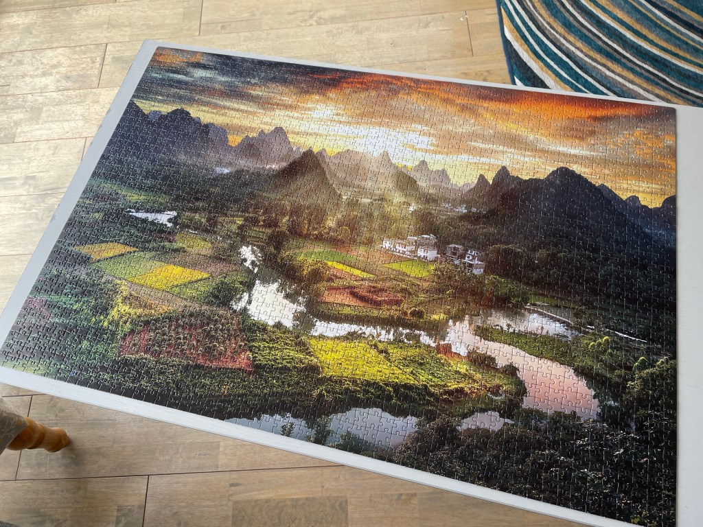 - The actual puzzle, forgetting it was 2000 pieces, was quite difficult – lots of similar blocks of colour: sky, trees, mountains, water, and all spread across the image.