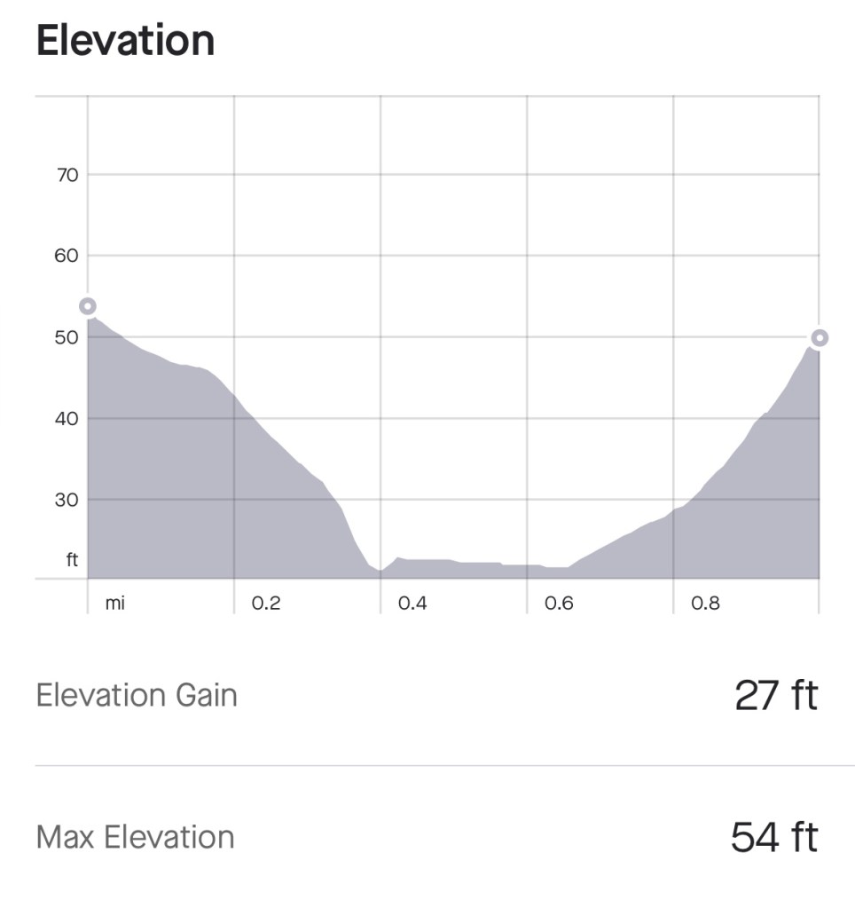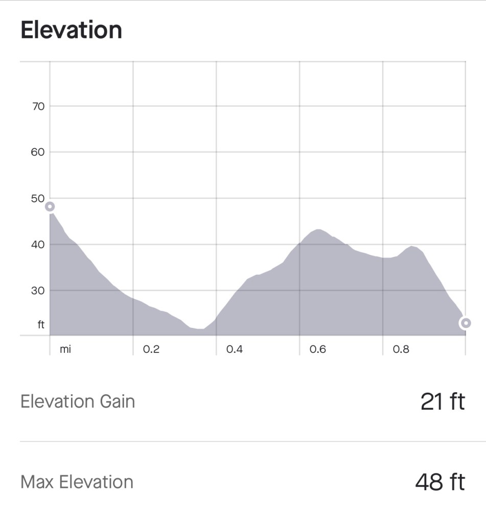 Without getting too technical I believe this mile might just be a bit more downhill. Strava says today’s route has 21ft elevation gain, compared with 27ft elevation gain on the old loop. So, a difference of 6ft: