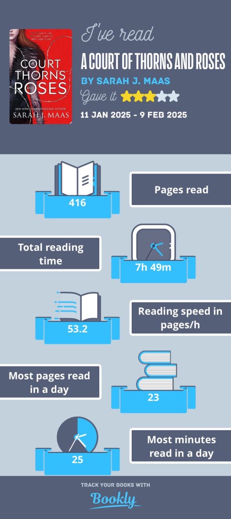 Apparently everyone knows this as ACOTAR, it’s the first in a very popular series. I think it is also comes under the genre of ‘high fantasy’.