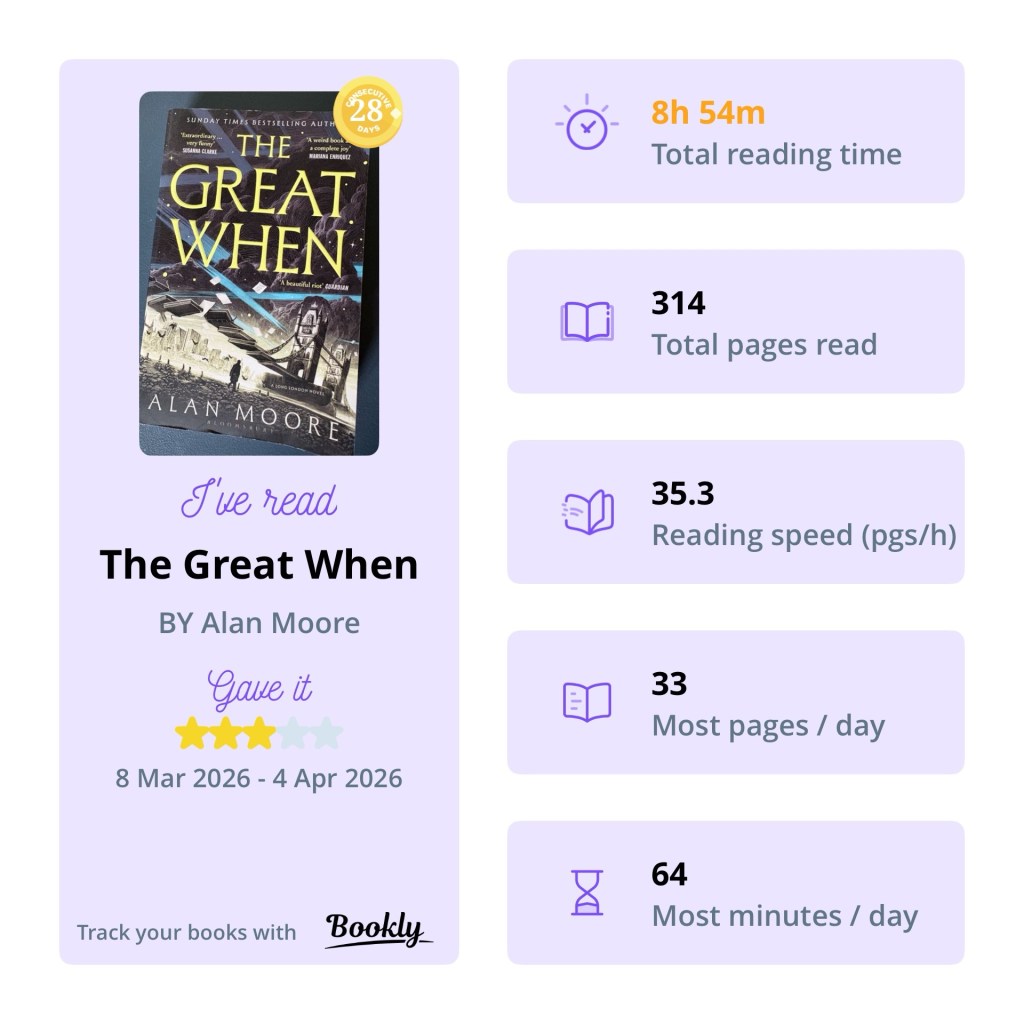 The novel is the first of an intended five: The Long London Quintet. It’s a fantasy novel, not really my thing, but I do occasionally dip in, following a lad called Dennis as he tries to return a book to the Great When.