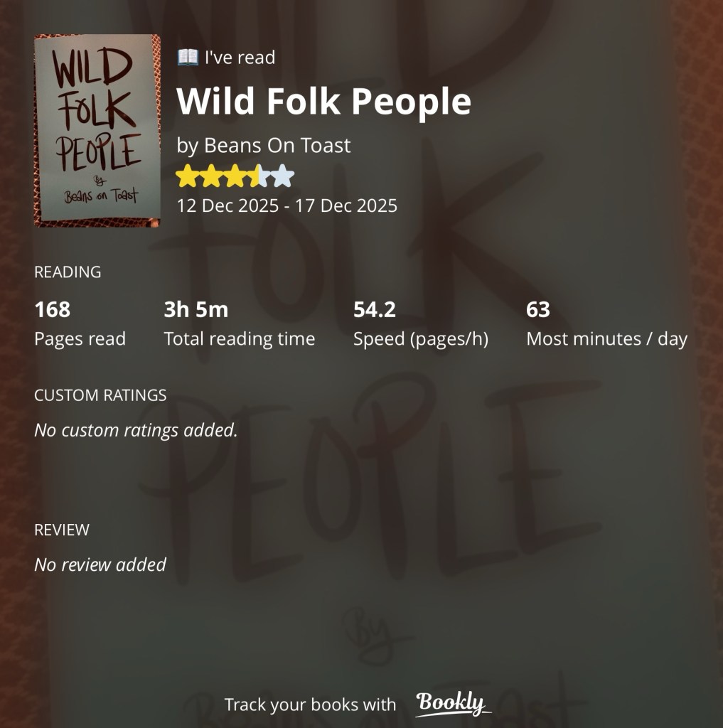 Beans on Toast is a folk singer that I’ve seen quite a few times. I love his music, he is a fantastic storyteller and folk singer. In this book he tells some heartwarming, rebellious and deeply human stories about various people who have inspired. They are the stories he often tells during his gigs – I’ve heard a few of these recently – they talk of connection, creativity and the beautiful mess of being alive.