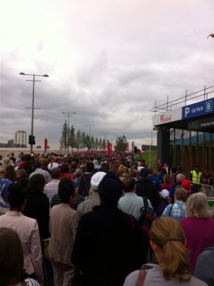 Leg one of the journey complete, train to London Bridge. Next up was a quick jump on the tube to Stratford. Didn't quite go to plan. As we entered the platform, we were greeted by the Great British public queuing in an orderly fashion (this would not be the last of today's queues) to the sounds of a tanoy, “We apologise for the delay – we have a signal failure on the Jubilee Line”. We waited for around 15mins, several trains coming and going, all packed solid, allowing very few passengers on board. A few prayers to Lord Coe later and we were on board, like the proverbial sardine. Various announcements, all completely ignored, told us to get off at West Ham if we were travelling to the Olympic Park. We therefore went past West Ham and duly got off at Stratford, with everyone else….